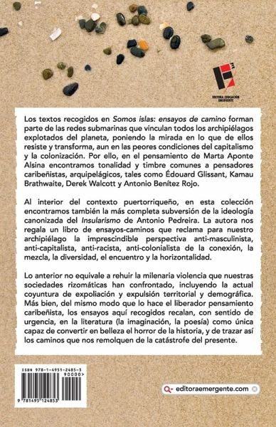 Los textos recogidos en Somos islas: ensayos de camino forman parte de las redes submarinas que vinculan todos los archipiélagos explotados del planeta, poniendo la mirada en lo que de ellos resiste y transforma aun las peores manifestaciones del capital y de la colonización. Por ello, en el pensamiento de Marta Aponte Alsina encontramos tonalidad y timbre comunes a pensadores caribeñistas, arquipelágicos, tales como Édouard Glissant, Kamau Brathwaite, Derek Walcott y Antonio Benítez Rojo. Al interior del contexto puertorriqueño, en esta colección encontramos también la más completa subversión de la ideología canonizada del Insularismo de Antonio Pedreira. La autora nos regala un libro de ensayos-caminos que reclama para nuestro archipiélago la imprescindible perspectiva anti-masculinista, anti-capitalista, anti-racista, anti-colonialista de la conexión, la mezcla, la diversidad, el encuentro y la horizontalidad. Lo anterior no equivale a rehuir la milenaria violencia que nuestras sociedades rizomáticas han confrontado, incluyendo la actual coyuntura de expoliación y expulsión territorial y demográfica. Más bien, del mismo modo que lo hace el liberador pensamiento caribeñista, los ensayos aquí recogidos recalan, con sentido de urgencia, en la literatura (la imaginación, la poesía) como única capaz de convertir en belleza el horror de la historia, y de trazar así los caminos que nos remolquen de la catástrofe del presente.