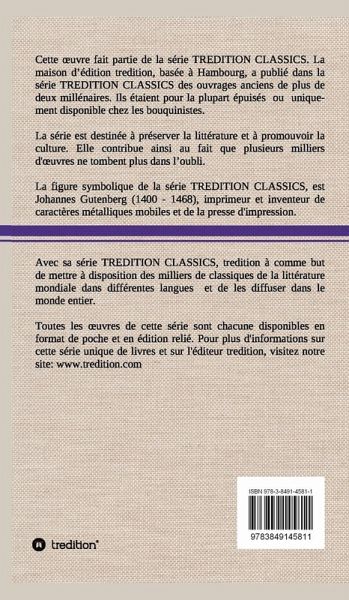 Cette uvre (édition relié) fait partie de la série TREDITION CLASSICS. La maison d édition tredition, basée à Hambourg, a publié dans la série TREDITION CLASSICS des ouvrages anciens de plus de deux millénaires. Ils étaient pour la plupart épuisés ou uniquement disponible chez les bouquinistes. La série est destinée à préserver la littérature et à promouvoir la culture. Avec sa série TREDITION CLASSICS, tredition à comme but de mettre à disposition des milliers de classiques de la littérature mondiale dans différentes langues et de les diffuser dans le monde entier.