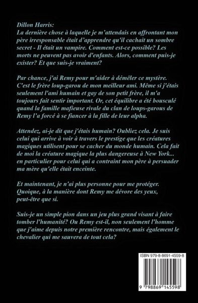 Dillon Harris:La dernière chose à laquelle je m'attendais en affrontant mon père irresponsable était d'apprendre qu'il cachait un sombre secret - Il était un vampire. Comment est-ce possible? Les morts ne peuvent pas avoir d'enfants. Alors, comment puis-je exister? Et que suis-je vraiment? Par chance, j'ai Remy pour m'aider à démêler ce mystère. C'est le frère loup-garou de mon meilleur ami. Même si j'étais seulement l'ami humain et gay de son petit frère, il m'a toujours fait sentir important. Or, cet équilibre a été bousculé quand la famille mafieuse rivale du clan de loups-garous de Remy l'a forcé à se fiancer à la fille de leur alpha. Attendez, ai-je dit que j'étais humain? Oubliez cela. Je suis celui qui arrive à voir à travers le prestige que les créatures magiques utilisent pour se cacher du monde humain. Cela fait de moi la créature magique la plus dangereuse à New York... en particulier pour celui qui a contraint mon père à persuader ma mère qu'elle était enceinte. Et maintenant, je n'ai plus personne pour me protéger. Quoique, à la manière dont Remy me dévore des yeux, peut-être que si. Suis-je un simple pion dans un jeu plus grand visant à faire tomber l'humanité? Ou Remy est-il, non seulement l'homme que j'aime depuis notre première rencontre, mais également le chevalier qui me sauvera de tout cela? Note: Ce livre fait partie de la collection "Love is Love" de l'auteur, ce qui signifie qu'il est disponible comme romance épicée dans Le Mariage Forcé de Mon Petit-Ami Mafieux, une romance torride avec un loup-garou dans Mon Loup Mafieux, et une romance entre hommes dans Problème de mariage mafieux, ainsi qu'une romance entre deux hommes avec un loup-garou dans Son Loup Protecteur.