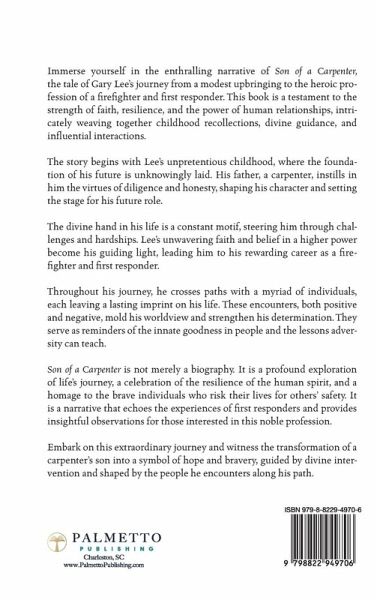 Journey of a Hero: From Innocent Childhood to Courageous Firefighter, Guided by Divine Intervention and Shaped by Influential Encounters. Dive into the captivating life story of a man, Gary Lee, who, inspired by his humble beginnings, ascends to the heroic role of a firefighter and first responder. This book, Son of a Carpenter, is a testament to the power of faith, resilience, and human connection. It is a narrative that seamlessly weaves together the threads of childhood memories, divine guidance, and impactful encounters. Lee's journey begins in the simplicity of childhood, where the seeds of his future are unknowingly sown. He learns the value of hard work and integrity from his father, a carpenter, whose influence becomes the cornerstone of his character. As he grows, so does his understanding of life's complexities and the role he is destined to play. The divine intervention in his life is a recurring theme, guiding him through trials and tribulations. It is a testament to his unwavering faith and belief in a higher power. His trust in God's plan becomes his compass, leading him to a fulfilling career as a firefighter and first responder. Along his path, he encounters a diverse array of individuals, each leaving an indelible mark on his life. These encounters, both good and bad, shape his perspective and fortify his resolve. They serve as reminders of the inherent goodness in people and the lessons to be learned from adversity. Son of a Carpenter is more than just a biography. It is a heartfelt exploration of life's journey, a celebration of the human spirit, and a tribute to the brave men and women who risk their lives for the safety of others.