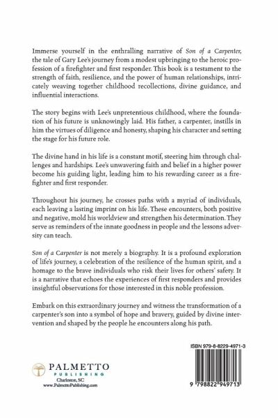 Journey of a Hero: From Innocent Childhood to Courageous Firefighter, Guided by Divine Intervention and Shaped by Influential Encounters. Dive into the captivating life story of a man, Gary Lee, who, inspired by his humble beginnings, ascends to the heroic role of a firefighter and first responder. This book, Son of a Carpenter, is a testament to the power of faith, resilience, and human connection. It is a narrative that seamlessly weaves together the threads of childhood memories, divine guidance, and impactful encounters. Lee's journey begins in the simplicity of childhood, where the seeds of his future are unknowingly sown. He learns the value of hard work and integrity from his father, a carpenter, whose influence becomes the cornerstone of his character. As he grows, so does his understanding of life's complexities and the role he is destined to play. The divine intervention in his life is a recurring theme, guiding him through trials and tribulations. It is a testament to his unwavering faith and belief in a higher power. His trust in God's plan becomes his compass, leading him to a fulfilling career as a firefighter and first responder. Along his path, he encounters a diverse array of individuals, each leaving an indelible mark on his life. These encounters, both good and bad, shape his perspective and fortify his resolve. They serve as reminders of the inherent goodness in people and the lessons to be learned from adversity. Son of a Carpenter is more than just a biography. It is a heartfelt exploration of life's journey, a celebration of the human spirit, and a tribute to the brave men and women who risk their lives for the safety of others.