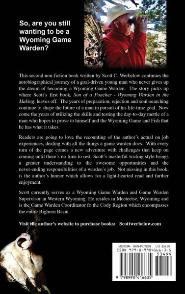 So, are you still wanting to be a Wyoming Game Warden? This second non-fiction book written by Scott C. Werbelow continues the autobiographical journey of a goal-driven young man who never gives up the dream of becoming a Wyoming Game Warden. The story picks up where Scott's first book, Son of a Poacher - Wyoming Warden in the Making, leaves off. The years of preparation, rejection and soul-searching continue to shape the future of a man in pursuit of his life-time goal. Now come the years of utilizing the skills and testing the day-to-day mettle of a man who hopes to prove to himself and the Wyoming Game and Fish that he has what it takes. Readers are going to love the recounting of the author' s actual on job experiences, dealing with all the things a game warden does. With every turn of the page comes a new adventure with challenges that keep on coming until there's no time to rest. Scott's masterful writing style brings a greater understanding to the awesome opportunities and the never-ending responsibilities of a warden's job. Not missing in this book, is the author's humor which allows for a light-hearted read and further enjoyment. Scott currently serves as a Wyoming Game Warden and Game Warden Supervisor in Western Wyoming. He resides in Meeteetse, Wyoming and is the Game Warden Coordinator for the Cody Region which encompasses the entire Bighorn Basin.