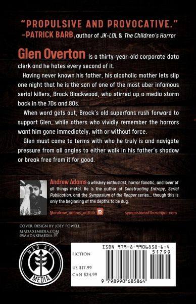 Glen Overton is a thirty-year-old corporate data clerk, and he hates every second of it. Having never known his father, his alcoholic mother lets slip one night that he is the son of one of the most uber infamous serial killers, Brock Blackwood, who stirred up a media storm back in the 70s and 80s. When word gets out, Brock's old superfans rush forward to support Glen, while others who vividly remember the horrors want him gone immediately, with or without force. Glen must come to terms with who he truly is and navigate pressure from all angles to either walk in his father's shadow or break free from it for good.
