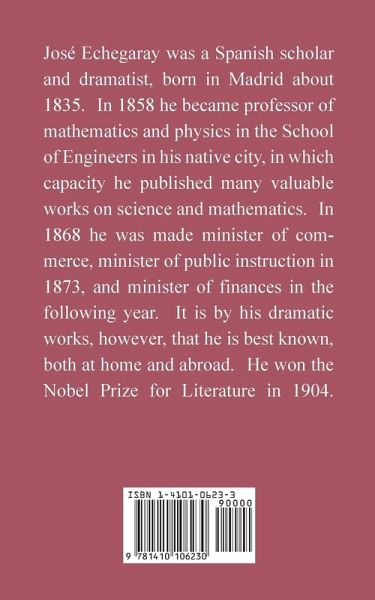 Jose Echegaray was a Spanish scholar and dramatist, born in Madrid about 1835. In 1858 he became professor of mathematics and physics in the School of Engineers in his native city, in which capacity he published many valuable works on science and mathematics. In 1868 he was made minister of commerce, minister of public instruction in 1873, and minister of finances in the following year. It is by his dramatic works, however, that he is best known, both at home and abroad. He won the Nobel Prize for Literature in 1904.