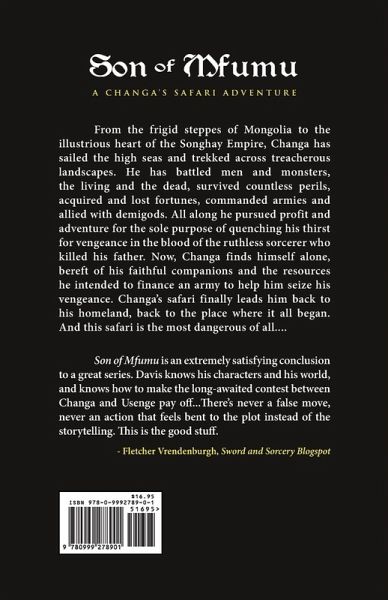From the frigid steppes of Mongolia to the illustrious heart of the Songhay Empire, Changa has sailed the high seas and trekked across treacherous landscapes. He has battled men and monsters, the living and the dead, survived countless perils, acquired and lost fortunes, commanded armies and allied with demigods. All along he pursued profit and adventure for the sole purpose of quenching his thirst for vengeance in the blood of the ruthless sorcerer who killed his father. Now, Changa finds himself alone, bereft of his faithful companions and the resources he intended to finance an army to help him seize his vengeance. Changa's safari finally leads him back to his homeland, back to the place where it all began. And this safari is the most dangerous of all...