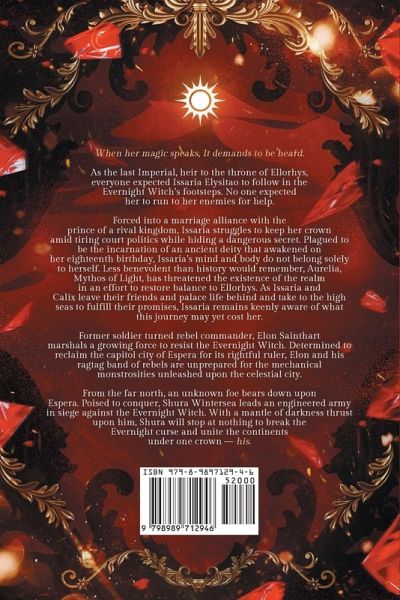 When her magic speaks, It demands to be heard. As the last Imperial, heir to the throne of Ellorhys, everyone expected Issaria Elysitao to follow in the Evernight Witch's footsteps. No one expected her to run to her enemies for help. Forced into a marriage alliance with the prince of a rival kingdom, Issaria struggles to keep her crown amid tiring court politics while hiding a dangerous secret. Plagued to be the incarnation of an ancient deity that awakened on her eighteenth birthday, Issaria's mind and body do not belong solely to herself. Less benevolent than history would remember, Aurelia, Mythos of Light, has threatened the existence of the realm in an effort to restore balance to Ellorhys. As Issaria and Calix leave their friends and palace life behind and take to the high seas to fulfill their promises, Issaria remains keenly aware of what this journey may yet cost her. Former soldier turned rebel commander, Elon Sainthart marshals a growing force to resist the Evernight Witch. Determined to reclaim the capitol city of Espera for its rightful ruler, Elon and his ragtag band of rebels are unprepared for the mechanical monstrosities unleashed upon the celestial city. From the far north, an unknown foe bears down upon Espera. Poised to conquer, Shura Wintersea leads an engineered army in siege against the Evernight Witch. With a mantle of darkness thrust upon him, Shura will stop at nothing to break the Evernight curse and unite the continents under one crown - his.