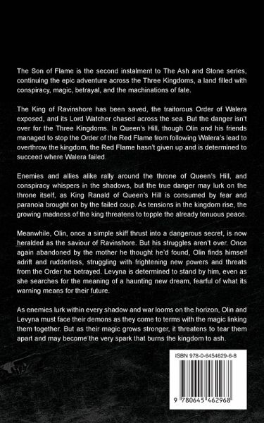 The Son of Flame is the second instalment to The Ash and Stone series, continuing the epic adventure across the Three Kingdoms, a land filled with conspiracy, magic, betrayal, and the machinations of fate. The King of Ravinshore has been saved, the traitorous Order of Walera exposed, and its Lord Watcher chased across the sea. But the danger isn't over for the Three Kingdoms. In Queen's Hill, though Olin and his friends managed to stop the Order of the Red Flame from following Walera's lead to overthrow the kingdom, the Red Flame hasn't given up and is determined to succeed where Walera failed. Enemies and allies alike rally around the throne of Queen's Hill, and conspiracy whispers in the shadows, but the true danger may lurk on the throne itself, as King Ranald of Queen's Hill is consumed by fear and paranoia brought on by the failed coup. As tensions in the kingdom rise, the growing madness of the king threatens to topple the already tenuous peace. Meanwhile, Olin, once a simple skiff thrust into a dangerous secret, is now heralded as the saviour of Ravinshore. But his struggles aren't over. Once again abandoned by the mother he thought he'd found, Olin finds himself adrift and rudderless, struggling with frightening new powers and threats from the Order he betrayed. Levyna is determined to stand by him, even as she searches for the meaning of a haunting new dream, fearful of what its warning means for their future. As enemies lurk within every shadow and war looms on the horizon, Olin and Levyna must face their demons as they come to terms with the magic linking them together. But as their magic grows stronger, it threatens to tear them apart and may become the very spark that burns the kingdom to ash.