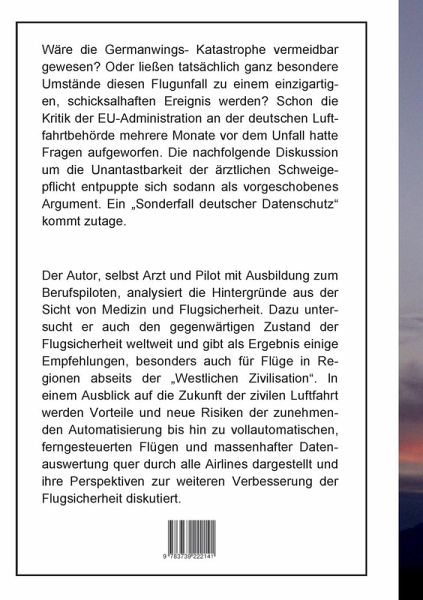 Achtung: Von diesem Buch gibt es eine Neuauflage, erschienen im November 2016, Titel: "Fliegen ist sicher, aber ..., Die Zukunft der Flugsicherheit", ISBN-10: 3741283282.Wäre die Germanwings-Katastrophe vermeidbar gewesen? Oder ließen tatsächlich ganz besondere Umstände diesen Flugunfall zu einem einzigartigen, schicksalhaften Ereignis werden? Schon die Kritik der EU-Administration an der deutschen Luftfahrtbehörde, mehrere Monate vor dem Unfall, hatte Fragen aufgeworfen. Die nachfolgende Diskussion um die Unantastbarkeit der ärztlichen Schweigepflicht entpuppte sich als vorgeschobene Erklärung. Ein "Sonderfall deutscher Datenschutz" kommt zutage. Flugmediziner tragen eine große Verantwortung. Sie entscheiden, wer als Pilot fliegen darf und wer nicht. Bei den Überlegungen rund um die Germanwings-Katastrophe fällt auf, dass es der rechtliche Rahmen für diese isolierte Entscheidungsposition der Flugmediziner ist, der zum Sicherheitsrisiko werden kann: ein Fehler in der Flugmedizin,oder die Täuschung von Fliegerarzt und Luftfahrtamt auf einem rechtlich möglichen Schleichweg, kann dadurch die gesamte technische Flugsicherheit nutzlos machen. Viele Flugmediziner fühlen sich mittlerweile in ihrer exponierten Lage gar nicht mehr wohl; im Gegenteil, manche sehen sich mit einem Verantwortungsumfang dorthin gesetzt, dem sie teilweise schon aus Prinzip gar nicht gerecht werden können. Aber welche Veränderungen kann man in dieser Klemme zwischen Schweigepflicht und Auftrag zum Schutz der Öffentlichkeit verlangen? Der Autor sammelt dazu Meinungen und Vorschläge - und Gesetzeslücken - die es zu schließen gilt.