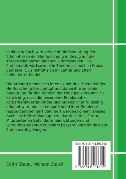 In diesem Buch wird versucht die Bedeutung der Erkenntnisse der Hirnforschung in Bezug auf die Körperbehindertenpädagogik darzustellen. Die Problematik wird sowohl in Theorie als auch in Praxis dargestellt. Es richtet sich an Lehrer und Eltern behinderter Kinder.Die Autoren haben sich intensiv mit der Thematik der Hirnforschung beschäftigt und dabei ihre zentrale Bedeutung für den Bereich der Pädagogik erkannt. Es ist wichtig, dass die besondere Problematik körperbehinderter Kinder und Jugendlicher frühzeitig erkannt wird und sie entsprechend ihrer Probleme ressourcenorientiert gefördert werden können. Dieses Buch soll Hilfestellung geben, damit Lehrer, Eltern, Mitarbeiter an Behinderteneinrichtungen und Lehramtsstudenten zu einem besseren Verständnis der Problematik gelangen.Homepage: www.staudbooks.de