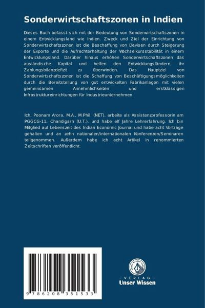 Dieses Buch befasst sich mit der Bedeutung von Sonderwirtschaftszonen in einem Entwicklungsland wie Indien. Zweck und Ziel der Einrichtung von Sonderwirtschaftszonen ist die Beschaffung von Devisen durch Steigerung der Exporte und die Aufrechterhaltung der Wechselkursstabilität in einem Entwicklungsland. Darüber hinaus erhöhen Sonderwirtschaftszonen das ausländische Kapital und helfen den Entwicklungsländern, ihr Zahlungsbilanzdefizit zu überwinden. Das Hauptziel von Sonderwirtschaftszonen ist die Schaffung von Beschäftigungsmöglichkeiten durch die Bereitstellung von gut entwickelten Fabrikanlagen mit vielen gemeinsamen Annehmlichkeiten und erstklassigen Infrastruktureinrichtungen für Industrieunternehmen.