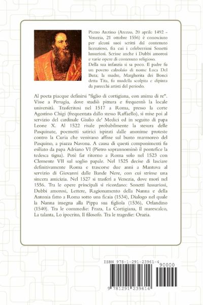 I Sonetti lussuriosi sono una raccolta di sonetti erotici pubblicati nel 1526. L'opera è divisa in due libri che raccolgono rispettivamente sedici e tredici composizioni. I sonetti sono ispirati dalle incisioni erotiche del pittore Marcantonio Raimondi (su disegni di Giulio Romano), pubblicate una prima volta nel 1524 sotto il titolo I Modi o Le 16 posizioni. Dubbi amorosi è una raccolta di brevi componimenti poetici (ottave e quartine) di Pietro Aretino scritta nel XVI secolo, poco dopo la composizione dei Sonetti lussuriosi nel 1526. La raccolta comprende ben trentuno "dubbi" ovvero piccole composizioni nelle quali Aretino sottolinea tramite brevi storie i problemi di mariti, di donne, di prostitute e di lussuriosi che riguardano solo il sesso. In seguito alla stesura di ciascun dubbio, l'Aretino inserisce una "risoluzione" nella quale inserisce delle massime e delle morali su come risolvere le varie situazioni (Aonia edizioni).