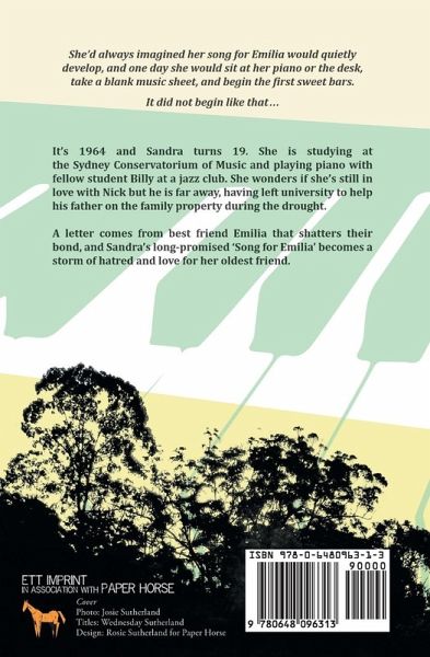 She'd always imagined her song for Emilia would quietly develop, and one day she would sit at her piano or the desk, take a blank music sheet, and begin the first sweet bars. It did not begin like that... It's 1964 and Sandra turns 19. She is studying at the Sydney Conservatorium of Music and playing piano with fellow student Billy at a jazz club. She wonders if she's still in love with Nick but he is far away, having left university to help his father on the family property during the drought. A letter comes from best friend Emilia that shatters their bond, and Sandra's long-promised 'Song for Emilia' becomes a storm of hatred and love for her oldest friend.