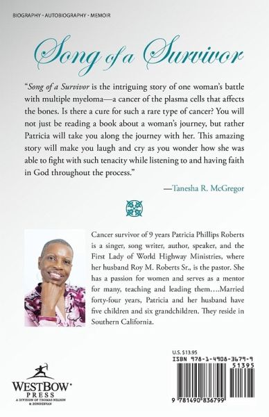 ?Song of a Survivor is the intriguing story of one woman?s battle with multiple myeloma?a cancer of the plasma cells that affects the bones. Is there a cure for such a rare type of cancer? You will not just be reading a book about a woman?s journey, but rather Patricia will take you along the journey with her. This amazing story will make you laugh and cry as you wonder how she was able to fight with such tenacity while listening to and having faith in God throughout the process.? ?Tanesha R. McGregor