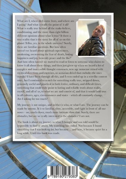 What am I, where do I come from, and where am I going? And what is really the point of it all? What is really true behind all the make-believe, conditioning, and the more than eight billion different opinions about what is true? It there a true reality that is the same for all of us on this planet Tellus, yes, in the whole universe? Surely, these are familiar questions. But how often have we not heard about spiritual experiences, awakening, overcoming the fear of death, lasting happiness and joy, heavenly peace and the like? And how often have we not started to read or listen to someone who claims to know it all about these things, and then just given up when we heard a lot of complex and inaccessible thought constructs, new age nonsense mixed with mystical directions and exercises, or sectarian drivel that excludes the ones outside? I have been through all this, and I even ended up in a sect-like context once, but I continued to search for something really true, stripped down, genuinely useful and practical in both festive, ordinary, and difficult times, something that could truly point to lasting and reliable truth about reality, myself, and all of us, to what we are and consist of, and that it would hold true in all cultures, ages, circumstances and states - which all constantly change. Am I asking for too much?My journey is not unique, and neither is who, or what I am. The journey can be made by anyone. It is so familiar, close, accessible, and right in front of all our noses - no, much closer, much more intimate than that. Surely, there are obstacles, but are we really interested in the obstacles? I am not.The book is about my journey to what I thought and was told would be impossible to find or attain. My searching has ended. Not because I found something that I was looking for, but because... and here, it became quiet for a long while. Until this book was made.