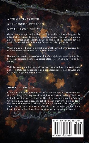 A female blacksmith... A handsome elvish lord... May the two never wed. Gwynneth is an apprentice blacksmith as well as a lord's daughter. In a land where female Elves are typically housewives, she's planning a glorious career as a blacksmith, just as soon as she completes her last week of apprenticeship. But her father has other plans for her... When she comes home from work one night, her father introduces her to a handsome elvish lord, Alec. Her intended. Her apprenticeship is canceled and she's told the date and time of her betrothal ceremony. She can either attend, or bring disgrace to her family. With her career on the line and her heart in shambles, she must make a choice. Defy her father and finish her apprenticeship, or let Alec and her father forge her path for her. You'll be sure to love this new adult multiple first person POV forced betrothal, forced proximity, strangers to lovers, romantasy with an epic siege battle, light magic, and epic fantasy action. Perfect for fans of The Lord of the Rings and A Court of Thorns and Roses.