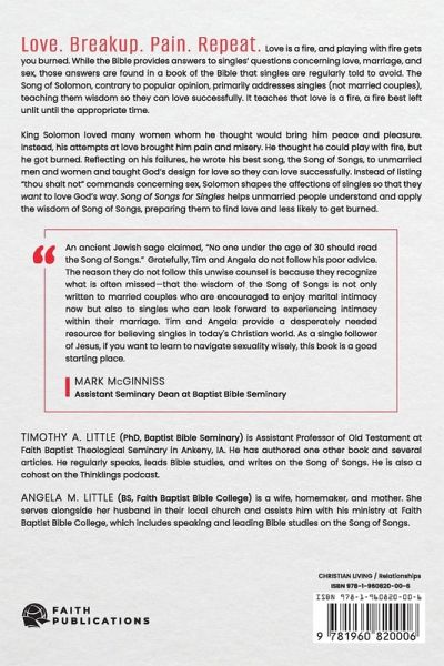Love. Breakup. Pain. Repeat. Love is a fire, and playing with fire gets you burned. While the Bible provides answers to singles' questions concerning love, marriage, and sex, those answers are found in a book of the Bible that singles are regularly told to avoid. The Song of Solomon, contrary to popular opinion, primarily addresses singles (not married couples), teaching them wisdom so they can love successfully. It teaches that love is a fire, a fire best left unlit until the appropriate time. King Solomon loved many women whom he thought would bring him peace and pleasure. Instead, his attempts at love brought him pain and misery. He thought he could play with fire, but he got burned. Reflecting on his failures, he wrote his best song, the Song of Songs, to unmarried men and women and taught God's design for love so they can love successfully. Instead of listing "thou shalt not" commands concerning sex, Solomon shapes the affections of singles so that they want to love God's way. Song of Songs for Singles helps unmarried people understand and apply the wisdom of Song of Songs, preparing them to find love and less likely to get burned. While the Bible teaches several "thou shalt not" commands concerning sexuality, the Song of Songs shapes the affections of singles so that they want to love God's way. Song of Songs for Singles seeks to emulate this design, cultivating the readers' affections for God's design for love. We do the things that we love. Singles love the wrong things. Too often, the church only preaches the "thou shalt not" sexual messages of the Bible. As C.S. Lewis chided in Abolition of Man, we chop down forests but fail to irrigate deserts. The Song of Songs satiates the unmarried Christian's thirst and equips them with the wisdom to love successfully.