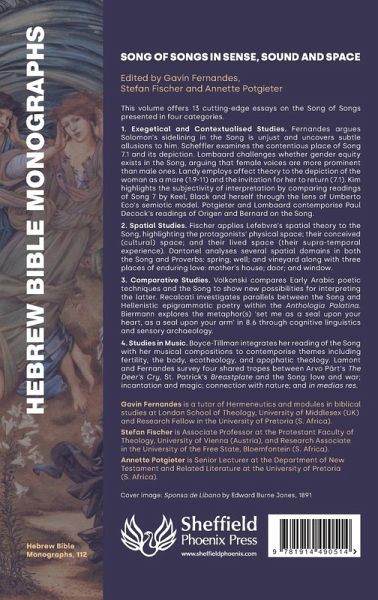This volume offers 13 cutting-edge essays on the Song of Songs presented in four categories. 1. Exegetical and Contextualised Studies. Fernandes argues Solomon's sidelining in the Song is unjust and uncovers subtle allusions to him. Scheffler examines the contentious place of Song 7.1 and its depiction. Lombaard challenges whether gender equity exists in the Song, arguing that female voices are more prominent than male ones. Landy employs affect theory to the depiction of the woman as a mare (1.9-11) and the invitation for her to return (7.1). Kim highlights the subjectivity of interpretation by comparing readings of Song 7 by Keel, Black and herself through the lens of Umberto Eco's semiotic model. Potgieter and Lombaard contemporise Paul Decock's readings of Origen and Bernard on the Song. 2. Spatial Studies. Fischer applies Lefebvre's spatial theory to the Song, highlighting the protagonists' physical space; their conceived (cultural) space; and their lived space (their supra-temporal experience). Dantonel analyses several spatial domains in both the Song and Proverbs: spring; well; and vineyard along with three places of enduring love: mother's house; door; and window. 3. Comparative Studies. Volkonski compares Early Arabic poetic techniques and the Song to show new possibilities for interpreting the latter. Recalcati investigates parallels between the Song and Hellenistic epigrammatic poetry within the Anthologia Palatina. Biermann explores the metaphor(s) 'set me as a seal upon your heart, as a seal upon your arm' in 8.6 through cognitive linguistics and sensory archaeology. 4. Studies in Music. Boyce-Tillman integrates her reading of the Song with her musical compositions to contemporise themes including fertility, the body, ecotheology, and apophatic theology. Lamont and Fernandes survey four shared tropes between Arvo Pärt's The Deer's Cry, St. Patrick's Breastplate and the Song: love and war; incantation and magic; connection with nature; and in medias res.