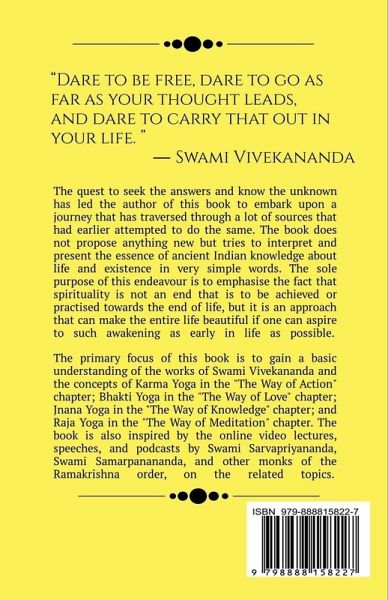 ""Spirituality does not teach one to walk a million miles, but it only guides one to take the first step"" The quest to seek the answers and know the unknown has led the author of this book to embark upon a journey that has traversed through a lot of sources that had earlier attempted to do the same. The book does not propose anything new but tries to interpret and present the essence of ancient Indian knowledge about life and existence, in very simple words. The sole purpose of this endeavour is to emphasise the fact spirituality is not an end that is to be achieved or practised towards the end of life, but it is an approach that can make the entire life beautiful if one can aspire to such awakening as early in life as possible. The primary focus of this book is to gain a basic understanding of the Works of Swami Vivekananda and the concepts of of Karma Yoga in the ""The Way of Action"" chapter, Bhakti Yoga in the ""The Way of Love"" chapter, Jnana Yoga in the ""The Way of Knowledge"" chapter, and Raja Yoga in the ""The Way of Meditation"" chapter. The book is also inspired by the online video lectures, speeches, and podcasts by Swami Sarvapriyananda, Swami Samarpanananda, and other monks of the Ramakrishna order, on the related topics.
