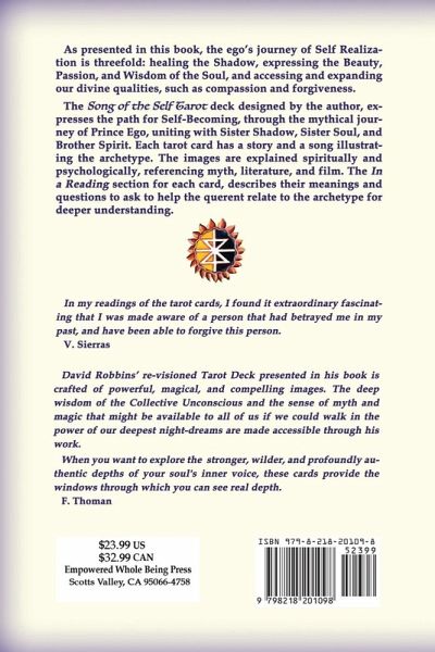 As presented in this book, the ego's journey of Self Realization is threefold: healing the Shadow, expressing the Beauty, Passion, and Wisdom of the Soul, and accessing and expanding our divine qualities, such as compassion and forgiveness. The Song of the Self Tarot deck designed by the author, expresses the path for Self-Becoming, through the mythical journey of Prince Ego, uniting with Sister Shadow, Sister Soul, and Brother Spirit. Each tarot card has a story, and a song illustrating the archetype. The images are explained spiritually and psychologically, referencing myth, literature, and film. The In a Reading section for each card, describes their meanings and questions to ask to help the querent relate to the archetype for deeper understanding. The twenty-two cards of the Major Arcana are the Keys to Love he travels through to complete the process. The reader is provided with Activations for Soul Growth, Creativity and Dreamwork, along with Affirmations, References and Recommended Reading to assist your journey of the Self. Also included are autobiographic examples of how the author relates to the keys. The Ten Universal Symbols of Manifestation is the author's condensed version of the minor arcana, showing the evolution of energy into the manifestation of the Self in wholeness.