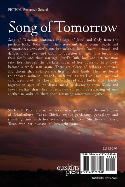 Looking for a good read? Look no more! SONG OF TOMORROW is filled with romance, intrigue, humor and drama. This book has it all! It's fiction but you'll feel like you have been transported into the real world of Cody and Jewel who you met in TEXAS JEWEL the previous book by Shirley M. Polk. Will Jewel and Cody be together again after the tragic accident that left him paralyzed? Will Cody recognize her when he awakens from the coma he has been in for the last six months? Is there a future for their marriage? Will he want to stay with her? Doubts and questions plague Jewel. People, events and circumstances consistently create havoc in her life. Despite betrayal Jewel never wavers in her commitment to help Cody become the man he was before the accident. Jewel's faith, love and determination see her through the darkest hours of her quest to help Cody. Complicating their relationship is the return of Cody's former fiancée...