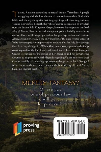 Turand. A nation abounding in natural beauty. Turandans. A people struggling with the loss of essential connections to their God, their faith, and the mystic spirits that long ago inspired them to greatness. Turand now suffers beneath the yoke of enemy occupation by invaders from the distant Sifiq Kingdom. Gregor, known to his subjects as the Dark King of Turand, lives in the nation's opulent palace, lavishly entertaining enemy officers while his people endure hunger, deprivation, and torture. Alexa, a young priestess, is the only member of the once revered Order of Val to have escaped violent persecution and death by the Sifiq. Her courage flows from unyielding faith. When Alexa mysteriously appears in the king's court to plead for the life of her condemned fiancé, Lord Victor Garogan, Gregor is stunned by the power of her presence and her unwavering devotion to his prisoner. Are the legends regarding Valiria priestesses true? Can he possibly risk releasing a prisoner as dangerous as Lord Garogan? More importantly, can he ever escape the bewildering effect of Alexa's haunting emerald eyes? MERELY FANTASY? Or are you one of precious few who will perceive deeper truth?