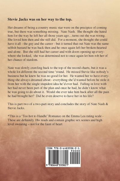 Stevie Jacks was on her way to the top. Her dreams of being a country music star were on the precipice of coming true, but there was something missing. Nate Nash. She thought she hated him for the way he left her all those years ago…turns out she was wrong. She loved him then and she still did. For a moment, she thought she could have it all - the guy and the career - but it turned that out Nate was the same selfish bastard he was back then and he once again left her broken-hearted and alone. But she still had her career and with doors opening up everywhere she looked, she was determined not to once again let him rob her of her chance of stardom. Nate was slowly crawling back to the top of the record charts, but it was a whole lot different the second time 'round. He missed Stevie like nobody's business but he knew he was no good for her. He wanted her to have everything she always dreamed about - everything she'd wanted before he stole it from her with the single stupidest idea he'd ever had. Falling in love with her had never been part of the plan and once he had, he didn't know what he was going to do about it. Would she ever take him back after all the pain he had brought her? Did he even deserve to have her in his life? This is part two of a two-part story and concludes the story of Nate Nash & Stevie Jacks. *This is a 'Too hot to Handle' Romance on the Emma Lea rating scale - These are definitely 18+ reads and contain graphic sex scenes and high level swearing - not for the faint of heart