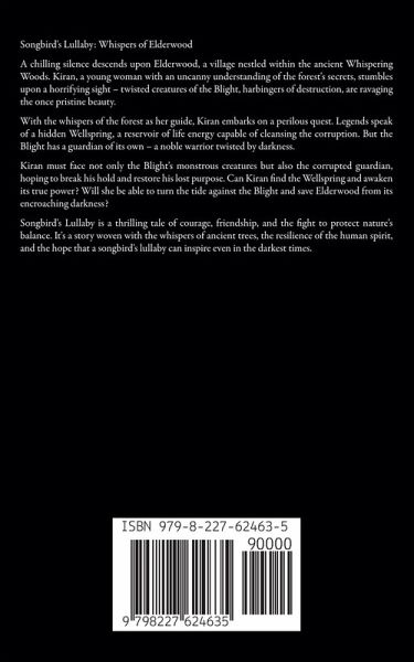 Songbird's Lullaby: Whispers of Elderwood A chilling silence descends upon Elderwood, a village nestled within the ancient Whispering Woods. Kiran, a young woman with an uncanny understanding of the forest's secrets, stumbles upon a horrifying sight - twisted creatures of the Blight, harbingers of destruction, are ravaging the once pristine beauty. With the whispers of the forest as her guide, Kiran embarks on a perilous quest. Legends speak of a hidden Wellspring, a reservoir of life energy capable of cleansing the corruption. But the Blight has a guardian of its own - a noble warrior twisted by darkness. Kiran must face not only the Blight's monstrous creatures but also the corrupted guardian, hoping to break his hold and restore his lost purpose. Can Kiran find the Wellspring and awaken its true power? Will she be able to turn the tide against the Blight and save Elderwood from its encroaching darkness? Songbird's Lullaby is a thrilling tale of courage, friendship, and the fight to protect nature's balance. It's a story woven with the whispers of ancient trees, the resilience of the human spirit, and the hope that a songbird's lullaby can inspire even in the darkest times.