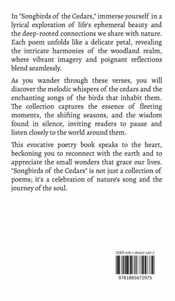 In "Songbirds of the Cedars," immerse yourself in a lyrical exploration of life's ephemeral beauty and the deep-rooted connections we share with nature. Each poem unfolds like a delicate petal, revealing the intricate harmonies of the woodland realm, where vibrant imagery and poignant reflections blend seamlessly. As you wander through these verses, you will discover the melodic whispers of the cedars and the enchanting songs of the birds that inhabit them. The collection captures the essence of fleeting moments, the shifting seasons, and the wisdom found in silence, inviting readers to pause and listen closely to the world around them. This evocative poetry book speaks to the heart, beckoning you to reconnect with the earth and to appreciate the small wonders that grace our lives. "Songbirds of the Cedars" is not just a collection of poems; it's a celebration of nature's song and the journey of the soul.