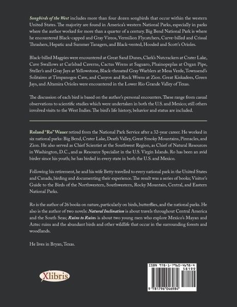 Songbirds of the West includes more than four dozen songbirds that occur within the western United States. The majority are found in America's western National Parks, especially in parks where the author worked for more than a quarter of a century. Big Bend National Park is where he encountered Black-capped and Gray Vireos, Vermilion Flycatchers, Curve-billed and Crissal Thrashers, Hepatic and Summer Tanagers, and Black-vented, Hooded and Scott's Orioles. Black-billed Magpies were encountered at Great Sand Dunes, Clark's Nutcrackers at Crater Lake, Cave Swallows at Carlsbad Caverns, Cactus Wrens at Saguaro, Phainopeplas at Organ Pipe, Steller's and Gray Jays at Yellowstone, Black-throated Gray Warblers at Mesa Verde, Townsend's Solitaires at Timpanogos Cave, and Canyon and Rock Wrens at Zion. Great Kiskadees, Green Jays, and Altamira Orioles were encountered in the Lower Rio Grande Valley of Texas. The discussion of each bird is based on the author's personal encounters. These range from casual observations to scientific studies which were undertaken in both the U.S. and Mexico; still others involved visits to the West Indies. The bird's life history, behavior and status are included.