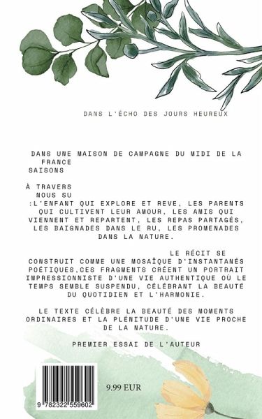 Dans une maison de campagne de Provence en France, une famille vit au rythme des saisons et des petits bonheurs quotidiens. À travers une série de vignettes poétiques, nous suivons leur vie simple mais riche :l'enfant qui explore et rêve, les parents qui cultivent leur amour, les amis qui viennent et repartent, les repas partagés, les baignades dans le ru, les promenades dans la nature. Sans intrigue linéaire, le récit se construit comme une mosaïque d'instantanés poétiques,ces fragments créent un portrait impressionniste d'une vie authentique où le temps semble suspendu, célébrant la beauté du quotidien, des moments ordinaires et la plénitude d'une vie proche de la nature. Premier essai de l'auteur