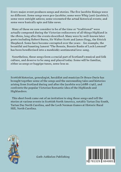 Every major event produces songs and stories. The five Jacobite Risings were no different. Some songs were pro-Jacobite; some were Whig (anti-Jacobite); some were outright satires; some recounted the actual historical events; and some were basically spin and fake news. Many of those we now consider to be of the time or "traditional" were actually composed during the Victorian rediscovery of all things Highland in the 1800s, long after the events described. Many were by well-known later poets including Robert Burns, Sir Walter Scott and James Hogg, "the Ettrick Shepherd". Some have become corrupted over the years - for example, the beautiful and haunting lament, The Bonnie, Bonnie Banks of Loch Lomond, has been bowdlerised into a mawkishly sentimental love-song. Nonetheless, these songs form a crucial part of Scotland's musical and folk culture, and deserve to be sung and played today. Some will be familiar, either as songs or bagpipe tunes, some less so. This short book came out of an invitation to sing some of these songs and tell the surrounding tales and histories arising from Scotland during and after the Jacobite era (1688-1746) at various events in 2019, notably Tartan Day South, Tartan Day North Carolina and the Loch Norman Games at Historic Rural Hill, North Carolina.
