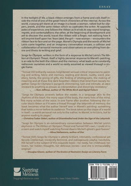 In the twilight of life, a black ribbon emerges from a frame and coils itself inside the mind of one of the great French chroniclers of the internal. Across the world, a young girl stares at an image in a book: a woman, naked but for slippers, jewels, and the same ribbon which so captivates the writer. At opposite poles of experience, one follows the ribbon as it winds its way round longings, regrets, and contemplations; the other, at the beginning of development and yet to discover the world, traces the ribbon with a finger, not realising how it will imprint itself upon her. Years later, the girl-now woman-encounters the ribbon face to face and on the page. Manet's Olympia and the words of Michel Leiris come together, and an imaginary conversation ensues. It will be a collision and collaboration of sensorial memories and observations on everything from desire and illness to writing and grief. These frames are used to examine both interlocutors; simultaneously, a frame of another sort is removed from Olympia and her artistic kin. Everything from her flowers, Louise Bourgeois's Sainte Sébastienne, and Francis Bacon's Henrietta Moraes are reimagined and given new regard. Songs for Olympia, written in the form of a response to Michel Leiris's The Ribbon at Olympia's Throat, itself a highly personal response to Manet's painting, is an ode to the both the ribbon and the memory: what leads us to constantly rediscover ourselves and a world so easily assumed as viewed through a single frame.