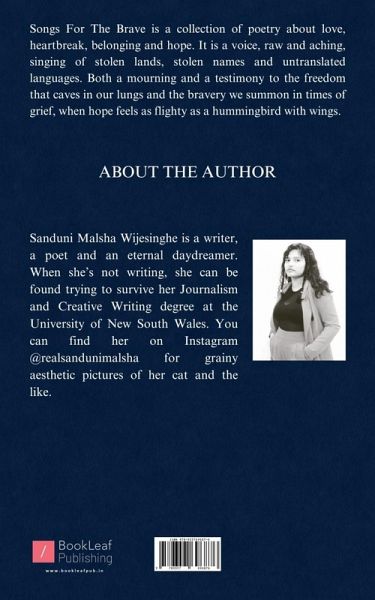 Songs For The Brave is a collection of poetry about love, heartbreak, belonging and hope. It is a voice, raw and aching, singing of stolen lands, stolen names and untranslated languages. Both a mourning and a testimony to the freedom that caves in our lungs and the bravery we summon in times of grief, when hope feels as flighty as a hummingbird with wings.