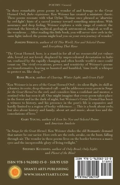 This impressive collection offers intimate, intense engagement with the great horned owl and the natural world. By casting every poem in the second person (every "you" is the great horned), the poems necessarily break into lament, rapture, and other rhythms of thought to meet the moment. Each poem is a healing song. Beneath the surface the reader will encounter grief, personal loss, sober reckonings with mankind and history, but also love, fervor, and always awe for this creature.