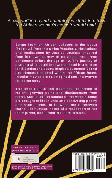 A raw, unfiltered and unapologetic look into how the African woman's memoir would read. Songs From an African Jukebox is the debut first novel from the series Vexations, Hesitations and Realisations by Jessica Uruakpa. Inspired from her own journey of moving across three continents before the age of 12.The journey of a young African girl into womanhood in a foreign land. Stories and poems inspired by memories and experiences observed within the African home. Popular movies are re-imagined and interwoven to tell her story. The often painful and traumatic experience of racism, growing pains and displacement from home. Stories all too familiar in the African home are brought to life in vivid and captivating poetry and short stories. In between the bittersweet truths; lies humour, hopes of a realisation of her inner power, -a rebirth is hers to claim.
