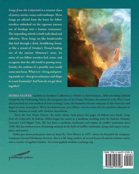 Debra Oliver was born in Southern California to a family in show business. After attending Juilliard School for the Performing Arts in the inaugural class of the Drama Division, she returned to the West Coast and launched her own method of actor training. Later, she founded a theater company in San Francisco and began to write screenplays. When her beloved son, Jove Oliver, was two years old, she and Jove relocated to Sedona, Arizona to study with Torkom Saraydarian.There she met Diane Harvey, the artist whose work graces the pages of Debra's new book, Songs from the Labyrinth. In Sedona, Debra began her career as a mediator, working with the Arizona Attorney General's Civil Rights Unit. She has been a mediator, facilitator, and trainer in conflict resolution since 1989. She has written scores of training manuals in the field of conflict resolution, along with essays, screenplays and poetry.Debra put down permanent roots in Santa Fe, New Mexico in 1997, where she founded the company, Common Ground Mediation Services. She is a life-long student of several facets of ancient wisdom and is now a teacher of applied wisdom. See www.applied-wisdom-teachings.org