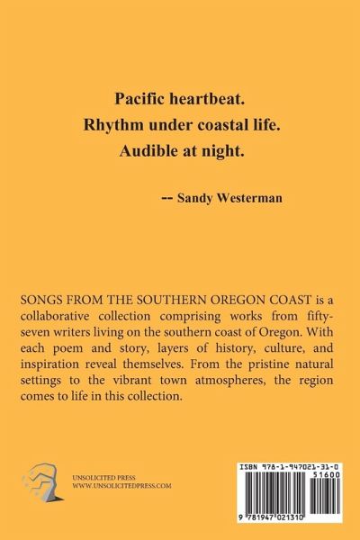 SONGS FROM THE SOUTHERN OREGON COAST is a collaborative collection comprising of works from fifty-seven writers living on the southern coast of Oregon. With each poem and story, layers of history, culture, and inspiration reveal themselves. From the pristine natural settings to the vibrant town atmospheres, the region comes to life in this collection.