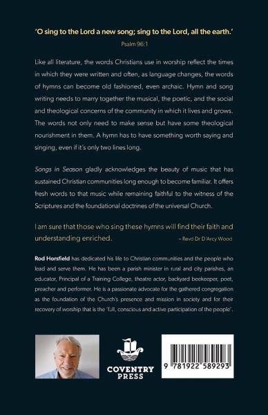 Like all literature, the words Christians use in worship reflect the times in which they were written and often, as language changes, the words of hymns can become old fashioned, even archaic. Hymn and song writing needs to marry together the musical, the poetic, and the social and theological concerns of the community in which it lives and grows. The words not only need to make sense but have some theological nourishment in them. A hymn has to have something worth saying and singing, even if it's only two lines long. Songs in Season gladly acknowledges the beauty of music that has sustained Christian communities long enough to become familiar. It offers fresh words to that music while remaining faithful to the witness of the Scriptures and the foundational doctrines of the universal Church.