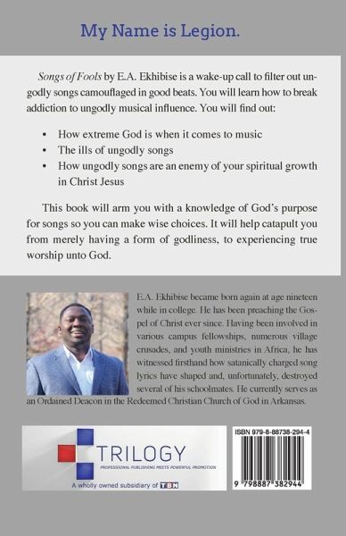 My Name is Legion. Songs of Fools by E.A. Ekhibise is a wake-up call to filter out ungodly songs camouflaged in good beats. You will learn how to break addiction to ungodly musical influence. You will find out: ¿ How extreme God is when it comes to music ¿ The ills of ungodly songs ¿ How ungodly songs are an enemy of your spiritual growth in Christ Jesus This book will arm you with a knowledge of God's purpose for songs so you can make wise choices. It will help catapult you from merely having a form of godliness, to experiencing true worship unto God.
