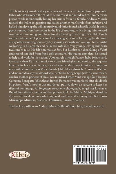 This book is a journal or diary of a man who rescues an infant from a psychotic father who determined the child to be his threat and murdered the mother with poison while intentionally hiding his crimes from his family. Andreas Munch rescued the infant in question and raised another man?s child from infancy and helped him develop the skills to survive and thrive in such a hostile world. It shows poetic sonnets from key points in the life of Andreas, which brings him toward comprehension and gratefulness for the blessing of raising this child of such sorrow and trauma. Upon facing life challenges, he must face struggles the same as any other wavering soul?by day showing strength and courage, but at night wallowing in his anxiety and pain. His wife died very young, leaving him with two sons to raise. He felt bitterness at first, but his first son died falling off cliff and second son died from frigid cold exposure. His trauma complete, he turned to help and work for his nation. Upon travels through France, Italy, Switzerland, Germany, then Russia in service to a dear friend given no choice, she requests him to raise her son as his own, for she knew her death was imminent. Similar to my mother?s mother was Vena Oneida Jehle Alexandrovich Romanov Walters, undenounced to anyone?s knowledge, her father being Sergei Jehle Alexandrovich, and her mother, princess of Hess, was murdered when Vena was age four. Pauline Catherine Bonaparte Jehle Alexandrovich Romanov was murdered after childbirth by poison. Vena?s mother was murdered, pushed down a staircase to keep her silent of her lineage. All forgotten except one photograph. Sergei was known as Rudolphus Walters, but in another photo G. D. McGinnis. Multiple identities discovered for these men who migrated and created so many families across Mississippi, Missouri, Alabama, Louisiana, Kansas, Arkansas. The book is a tribute to Andreas Munch?s life. Without him, I would not exist.