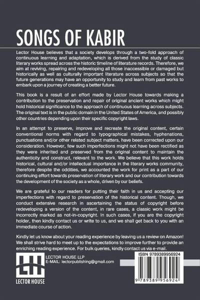 Songs Of Kabir: Translated By Rabindranath Tagore With The Assistance Of Evelyn Underhill This book is a result of an effort made by us towards making a contribution to the preservation and repair of original classic literature. In an attempt to preserve, improve and recreate the original content, we have worked towards: 1. Type-setting & Reformatting: The complete work has been re-designed via professional layout, formatting and type-setting tools to re-create the same edition with rich typography, graphics, high quality images, and table elements, giving our readers the feel of holding a 'fresh and newly' reprinted and/or revised edition, as opposed to other scanned & printed (Optical Character Recognition - OCR) reproductions. 2. Correction of imperfections: As the work was re-created from the scratch, therefore, it was vetted to rectify certain conventional norms with regard to typographical mistakes, hyphenations, punctuations, blurred images, missing content/pages, and/or other related subject matters, upon our consideration. Every attempt was made to rectify the imperfections related to omitted constructs in the original edition via other references. However, a few of such imperfections which could not be rectified due to intentional\unintentional omission of content in the original edition, were inherited and preserved from the original work to maintain the authenticity and construct, relevant to the work. We believe that this work holds historical, cultural and/or intellectual importance in the literary works community, therefore despite the oddities, we accounted the work for print as a part of our continuing effort towards preservation of literary work and our contribution towards the development of the society as a whole, driven by our beliefs. We are grateful to our readers for putting their faith in us and accepting our imperfections with regard to preservation of the historical content. HAPPY READING!
