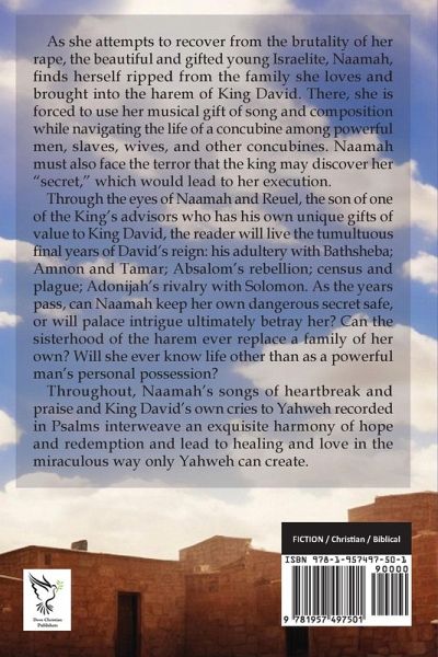As she attempts to recover from the brutality of her rape, the beautiful and gifted young Israelite, Naamah, finds herself ripped from the family she loves and brought into the harem of King David. There, she is forced to use her musical gift of song and composition while navigating the life of a concubine among powerful men, slaves, wives, and other concubines. Naamah must also face the terror that the king may discover her "secret," which would lead to her execution. Through the eyes of Naamah and Reuel, the son of one of the King's advisors who has his own unique gifts of value to King David, the reader will live the tumultuous final years of David's reign: his adultery with Bathsheba; Amnon and Tamar; Absalom's rebellion; Census and plague; Adonijah's rivalry with Solomon. As the years pass, can Naamah keep her own dangerous secret safe, or will palace intrigue ultimately betray her? Can the sisterhood of the harem ever replace a family of her own? Will she ever know life other than as a powerful man's personal possession? Throughout, Naamah's songs of heartbreak and praise and King David's own cries to Yahweh recorded in the book of Psalms interweave an exquisite harmony of hope and redemption and lead to healing and love in the miraculous way only Yahweh can create.