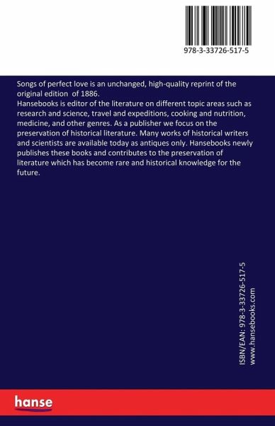 Songs of perfect love is an unchanged, high-quality reprint of the original edition of 1886.Hansebooks is editor of the literature on different topic areas such as research and science, travel and expeditions, cooking and nutrition, medicine, and other genres. As a publisher we focus on the preservation of historical literature. Many works of historical writers and scientists are available today as antiques only. Hansebooks newly publishes these books and contributes to the preservation of literature which has become rare and historical knowledge for the future.