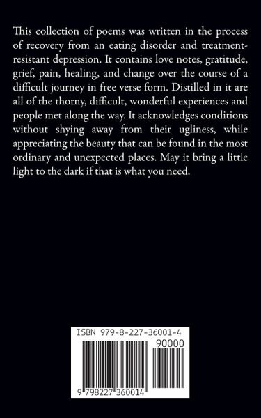 This collection of poems was written in the process of recovery from an eating disorder and treatment-resistant depression. It contains love notes, gratitude, grief, pain, healing, and change over the course of a difficult journey in free verse form. Distilled in it are all of the thorny, difficult, wonderful experiences and people met along the way. It acknowledges conditions without shying away from their ugliness, while appreciating the beauty that can be found in the most ordinary and unexpected places. May it bring a little light to the dark if that is what you need.