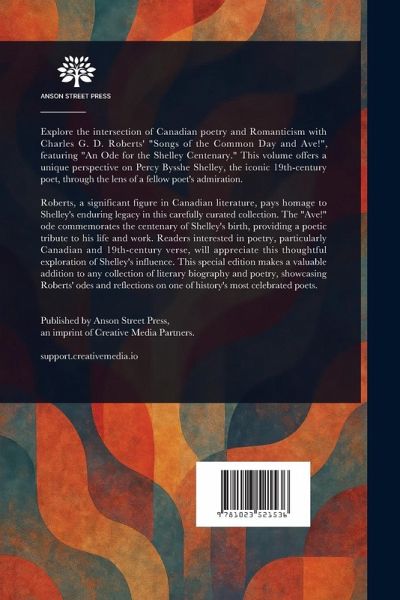 Explore the intersection of Canadian poetry and Romanticism with Charles G. D. Roberts' "Songs of the Common Day and Ave!", featuring "An Ode for the Shelley Centenary." This volume offers a unique perspective on Percy Bysshe Shelley, the iconic 19th-century poet, through the lens of a fellow poet's admiration. Roberts, a significant figure in Canadian literature, pays homage to Shelley's enduring legacy in this carefully curated collection. The "Ave!" ode commemorates the centenary of Shelley's birth, providing a poetic tribute to his life and work. Readers interested in poetry, particularly Canadian and 19th-century verse, will appreciate this thoughtful exploration of Shelley's influence. This special edition makes a valuable addition to any collection of literary biography and poetry, showcasing Roberts' odes and reflections on one of history's most celebrated poets. This work has been selected by scholars as being culturally important, and is part of the knowledge base of civilization as we know it. This work is in the public domain in the United States of America, and possibly other nations. Within the United States, you may freely copy and distribute this work, as no entity (individual or corporate) has a copyright on the body of the work. Scholars believe, and we concur, that this work is important enough to be preserved, reproduced, and made generally available to the public. We appreciate your support of the preservation process, and thank you for being an important part of keeping this knowledge alive and relevant.