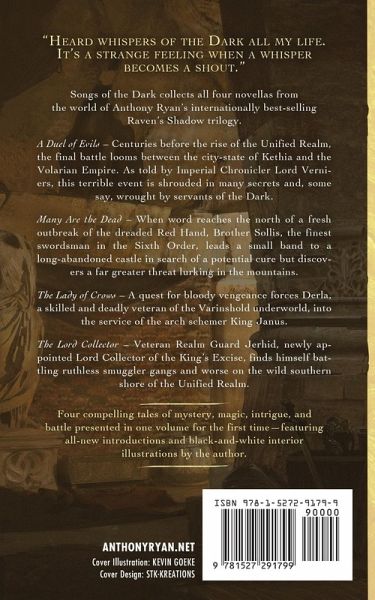 "Heard whispers of the Dark all my life. It's a strange feeling when a whisper becomes a shout." SONGS OF THE DARK collects all four novellas from the world of Anthony Ryan's internationally best-selling Raven's Shadow trilogy. Centuries before the rise of the Unified Realm, the final battle looms between the city state of Kethia and the Volarian Empire. As told by Imperial Chronicler Lord Verniers, this terrible event is shrouded in many secrets and, some say, wrought by servants of the Dark. When word reaches the north of a fresh outbreak of the dreaded Red Hand, Brother Sollis, the finest swordsman in the Sixth Order, leads a small band to a long-abandoned castle in search of a potential cure, but discovers a far greater threat lurking in the mountains. A quest for bloody vengeance forces Derla, a skilled and deadly veteran of the Varinshold underworld, into the service of the arch schemer King Janus. Veteran Realm Guard Jerhid, newly appointed Lord Collector of the King's Excise, finds himself battling ruthless smuggler gangs and worse on the wild southern shore of the Unified Realm. Four compelling tales of mystery, magic, intrigue and battle presented in one volume for the first time - featuring all new introductions and illustrations by the author.
