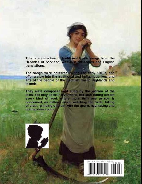 This is a collection of traditional Gaelic songs from the Hebrides of Scotland, with musical scores and English translations. They were collected during the early 1900s when the people of the Scottish Highlands and Islands still lived a traditional lifestyle they had followed for hundreds of years. The songs were composed and sung by the women of the Isles, not only at their diversions, but also during almost every kind of work where more than one person is concerned, as milking cows, watching the folds, fulling of cloth, grinding of grain with the quern, haymaking and cutting down corn.