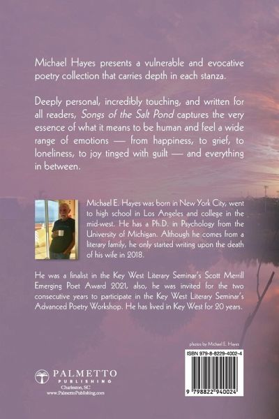Debut poet Michael Hayes distills the last 20 years of his life in Key West into a moving collection of 40+ poems and dozens of pictures - each evoking the senses and stirring a deep well of emotions from author to reader. Inspired by the French Symbolists and the social realism of the 1930s and 40s, Michael Hayes presents a vulnerable and evocative poetry collection that carries depth in each stanza. The collection of over 40 poems and photographs chronicle a season in his life and are divided into three parts: * An Autobiography of Loss * One Human Family * Age: A Predatory Fish Flipping between poems about life in general and the natural beauty of Key West, Michael deftly uses free-verse poems to illustrate the many parts of his life. Among the most poignant are "She Knew" and "Wind-Blown Memories," both of which deal with the author's loss of his wife of 45 years. Deeply personal, incredibly touching, and written for all readers, not just poetry lovers, Songs of the Salt Pond captures the very essence of what it means to be human and feel a wide range of emotions - from happiness, to grief, to loneliness, to joy tinged with guilt - and everything in between. Poetry lovers will want Songs of the Salt Pond on their shelves, but they're not the only ones who will enjoy it. Key West residents, widowers, and readers with a penchant for meaningful narratives will devour the poems in Songs of the Salt Pond as well.