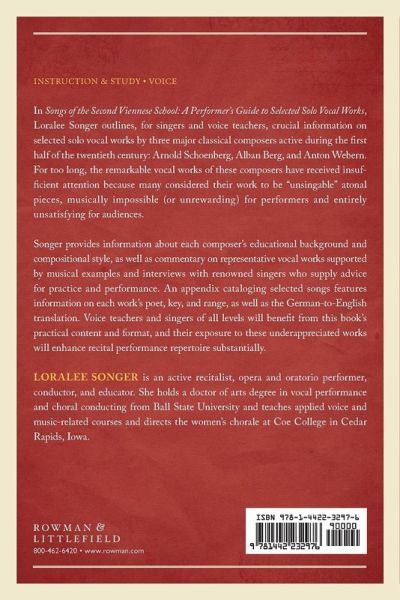 In Songs of the Second Viennese School: A Performer’s Guide to Selected Solo Vocal Works, scholar Loralee Songer outlines for singers and teachers of singers critical information on solo vocal works by three major classical composers, all active during the first half of the twentieth century: Arnold Schoenberg, Alban Berg, and Anton Webern.