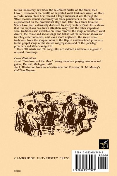 In this innovatory new book the celebrated writer on the blues, Paul Oliver, rediscovers the wealth of neglected vocal traditions issued on Race records. When blues first reached a large audience it was through the 'Race records' issued specifically for black purchasers in the 1920s. Blues as performed on the professional stage and, later, folk blues from the South have been extensively discussed by many writers. Paul Oliver shows that this emphasis has drawn attention away from the other important vocal traditions also available on Race records: the songs of Southern rural dances, the comic and social songs and ballads of the medicine shows and traveling entertainments, and, even more neglected, the sacred vocal traditions, from the song-sermons of the Baptist and Sanctified preachers to the gospel songs of the church congregations and of the 'jack-leg' preachers and street evangelists. Over 500 artists and 700 song titles are indexed and there is a guide to reissued recordings.